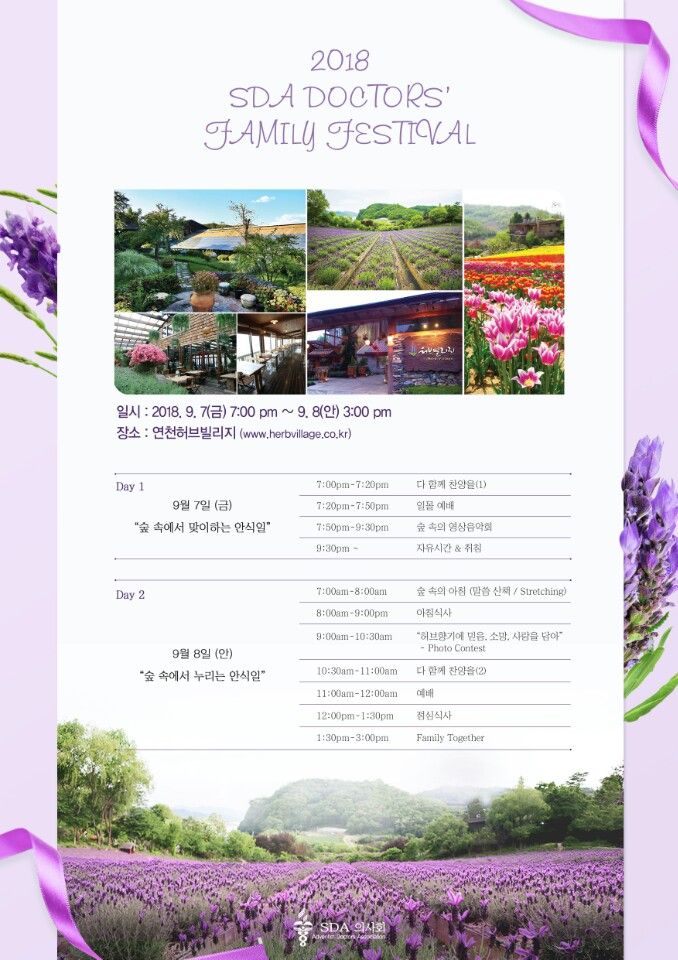 2018 SDA의사회 Family Festival 개최 작성일자 2018년 8월 12일2019년 1월 27일 글쓴이 관리자 2018 SDA의사회 Family Festival이 9월 7일-8일까지 연천허브빌리지에서 개최됩니다.